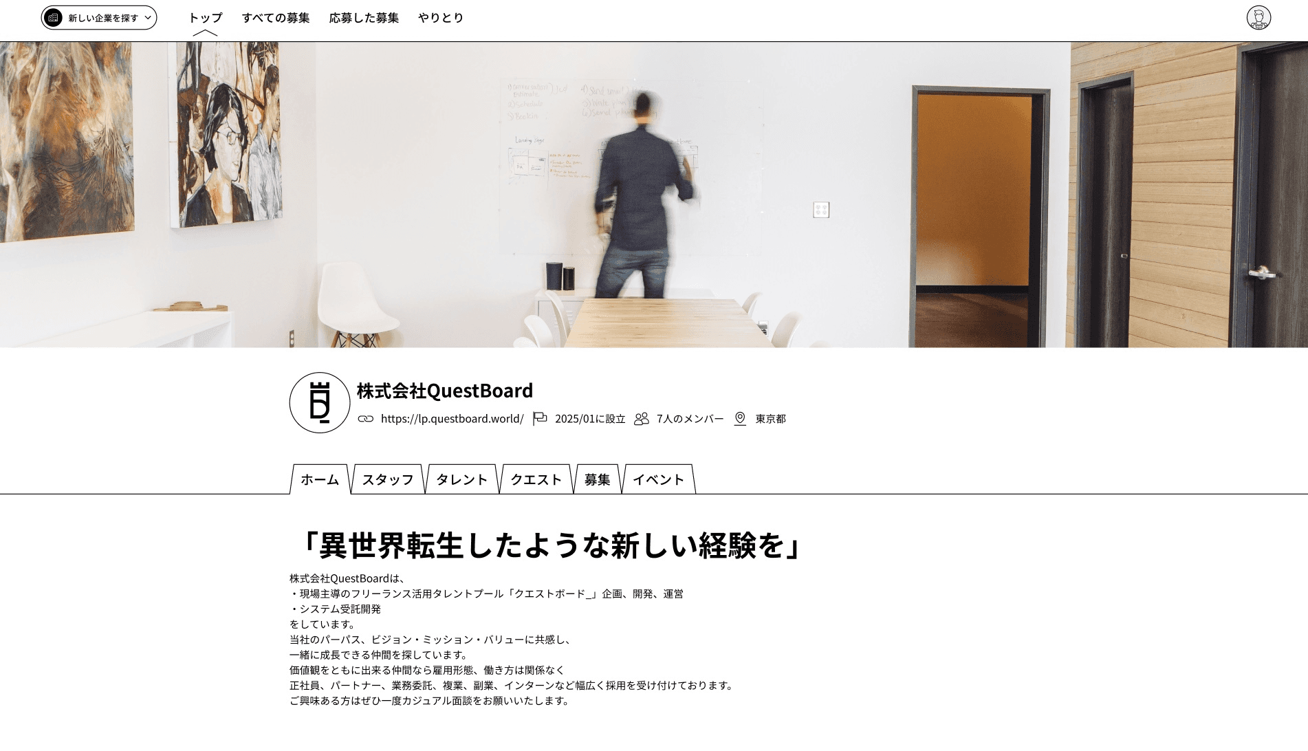 クエストボード_コネクト上に企業様情報や、企業様からのクエスト(お仕事依頼)を掲載していただくことで、企業様に興味を持った新しい採用候補者様からコンタクト申請を受け取ることができます。